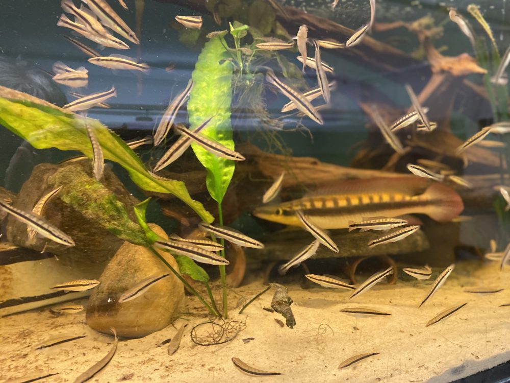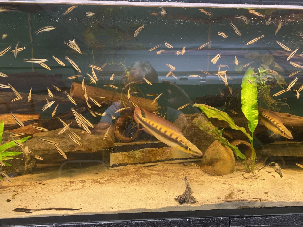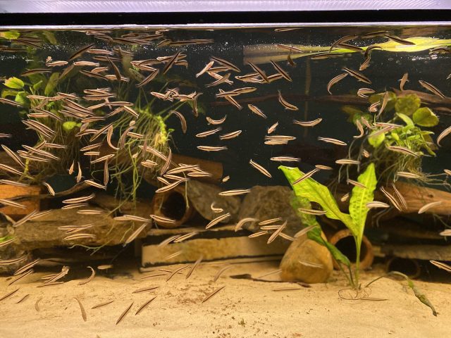 Die Zucht ist sehr schwierig, aber in Deutschland bereits gelungen. So bekam ich meine Crenis als NZ im Herbst 2019. Sie zogen gleich in mein 3 m Becken zusammen mit Geophagus sveni ein und wuchsen prächtig heran. Als die Geschlechtsreife eintrat mußten die überzähligen 5 Männchen weichen. Somit wurde 2021 aus Männchen und Weibchen so langsam ein Paar. Im April entdeckte ich das erste Gelege. Jedoch entwickeltne sich aus diesem und den nächsten 2 Folgegelegen leider keine Jungfische. Während dieser Zeit wurden die Wasserwerte immer mehr in extreme Bereiche geändert. Und erst jetzt im Juni 2021 mit Leitwert 200, Temperatur 29°C und pH 4,83 entwickelte sich aus Gelege Nr. 4 ein ansehnlicher Jungfischschwarm. Dieser wird 3 x täglich mit großen Mengen Artemia Nauplien gefüttert. Sie wachsen im Verhältnis zu anderen Cichliden relativ schnell heran. - Ernährung:
